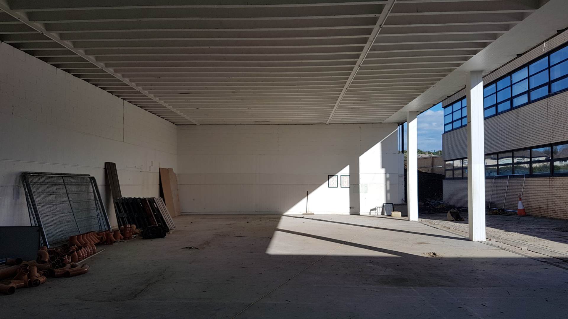 The rubble from the gym wall has been removed and the open space and light in the gym has been fully realised for the first time. The back stairs is now completely gone!