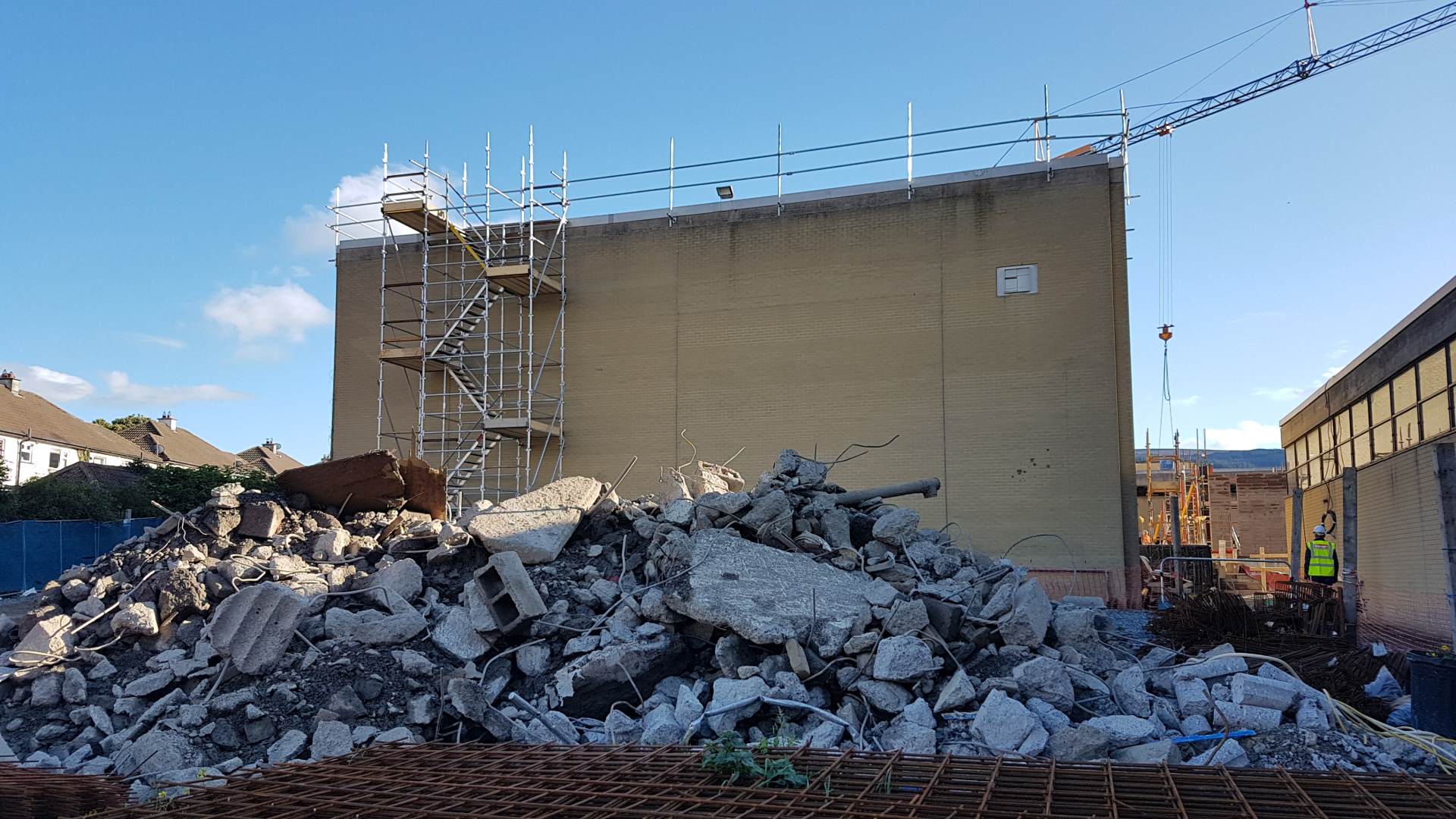 After the site was secured and the access route completed, the initial work was predominately deconstruction. This involved removing the glazing and completely gutting the gym building and removal of the front entrance hall of the sports hall. As the main fuse board and switches for all of the electrics in the sports hall were in the front entrance, this was a delicate process.