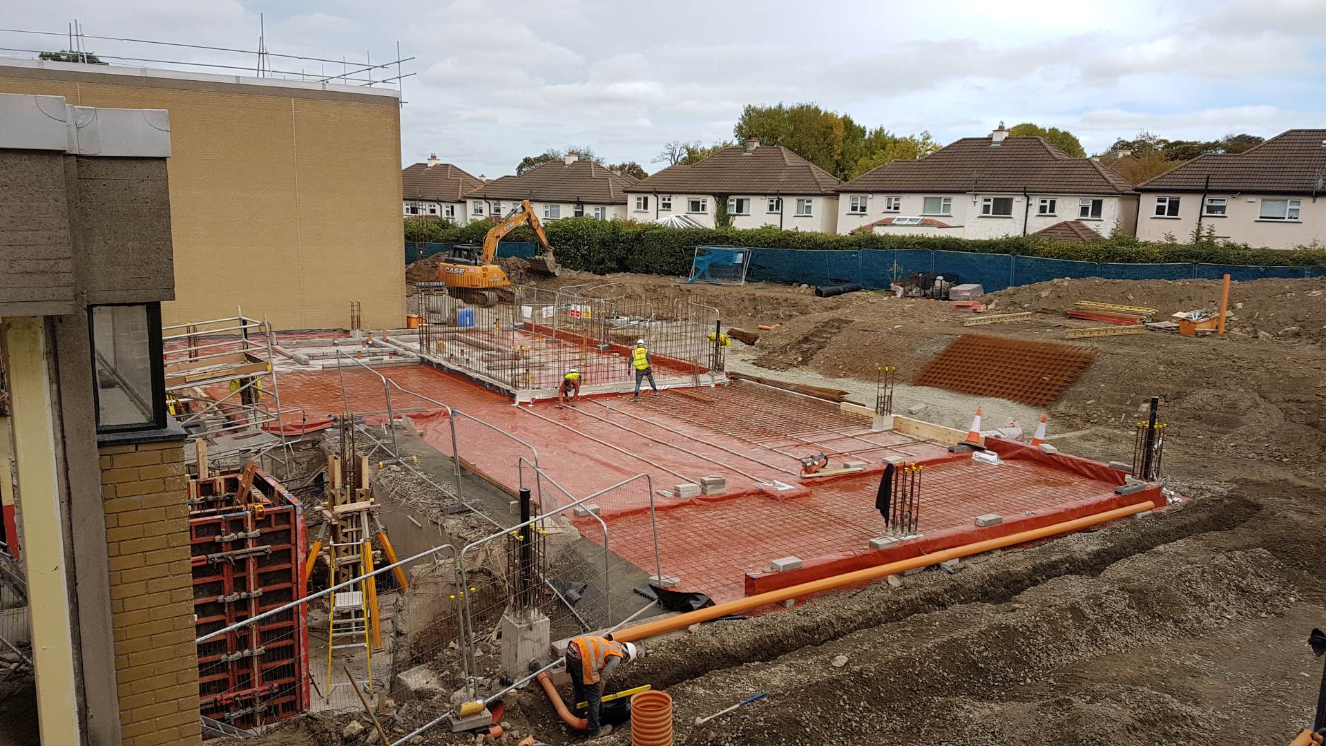 Over the past fortnight, great progress has been made on the Project 2018 construction site. Following the completion of the foundations and rising walls at the site of the new classrooms, an orange radon barrier was installed over the insulation and hardcore. Underneath this barrier are radon sumps that allow the harmful gases to be safely removed from the foundations and dissipated into the atmosphere.