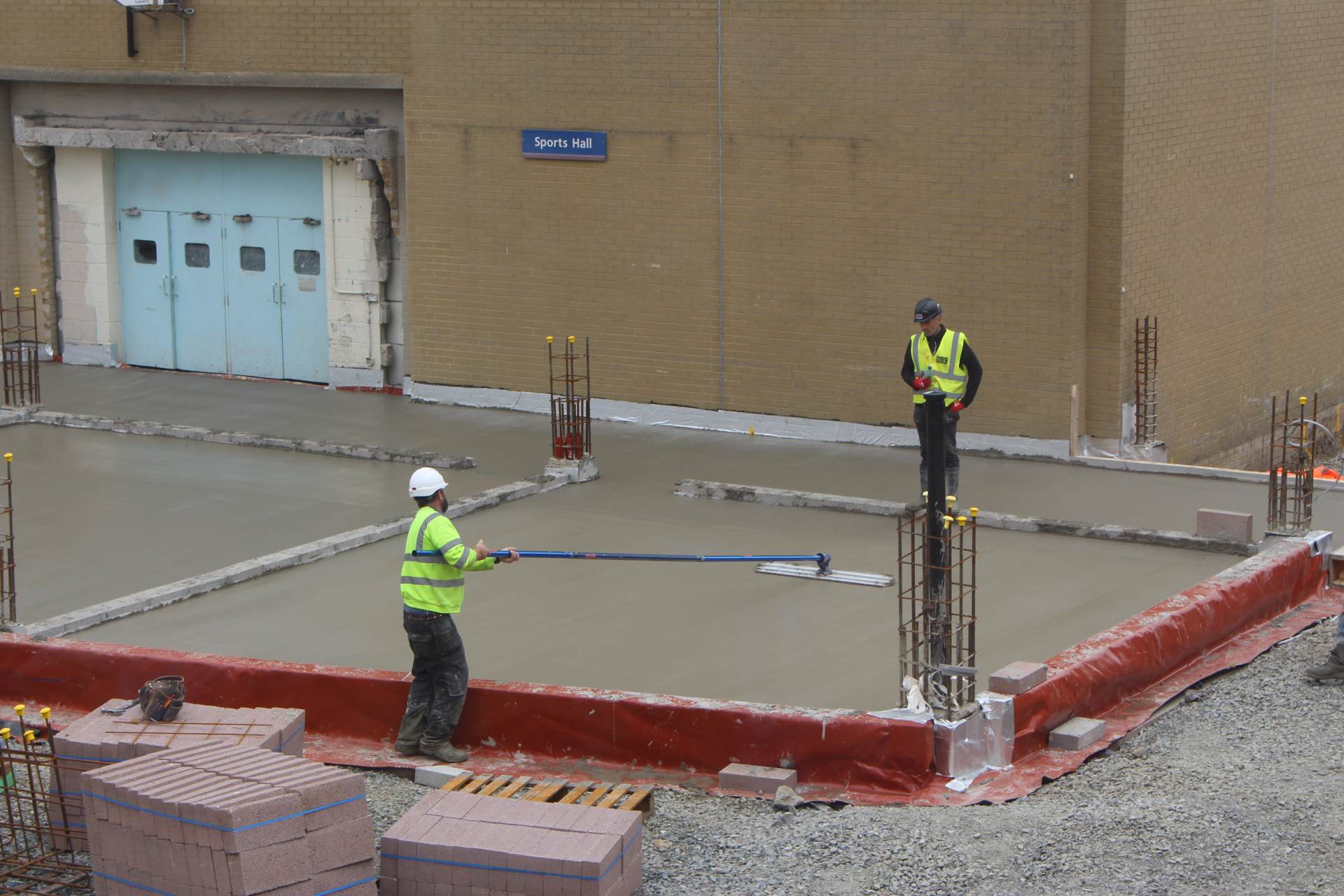 The main purpose of the radon barrier is to prevent radon gas from penetrating through the ground into the building but it also acts a barrier to the passage of moisture rising into the ground floor and walls of the new classrooms. As can be seen in the photograph, steel reinforcement mesh was then laid and tied together over the radon barrier to provide strength to the concrete floors which were to be poured.