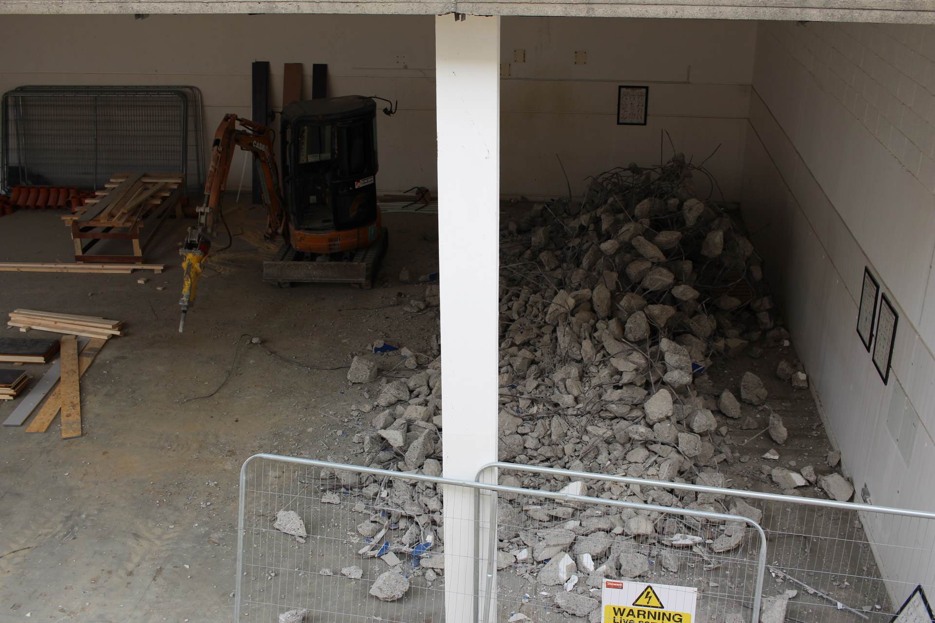 Finally, further deconstruction took place in the gym as the internal wall that divided the weights areas from the rest of the gym was demolished. The mass of concrete and steel came down with the help of a hydraulic jackhammer. Work has also begun on removing the stairs at the rear of the gym. This will ultimately become a PE storage area.