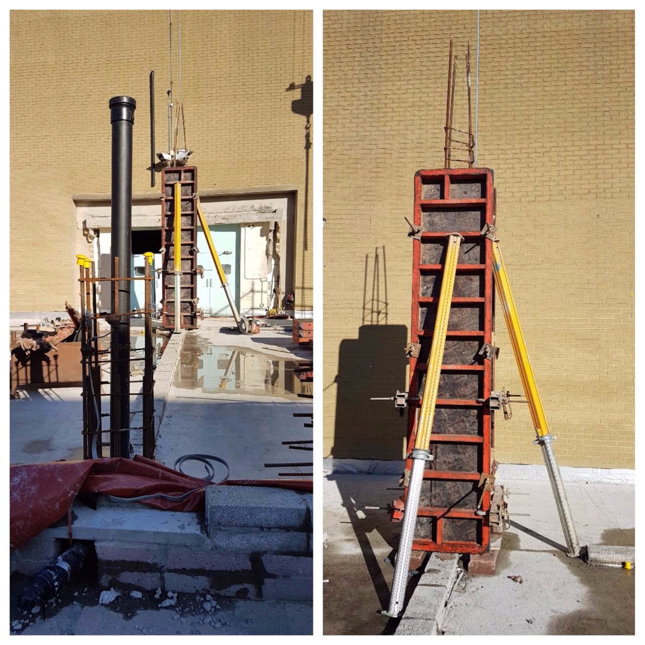 These columns are constructed by initially tying vertical reinforced steel to the foundations before the concrete was poured to form the ground floor. Once the steel is ready, formwork is constructed around the steel frame in a rectangular profile and built up to the height of the first floor. The concrete is poured in until it reaches the correct height and left to cure. Often the columns have a service pipe that runs down through them.