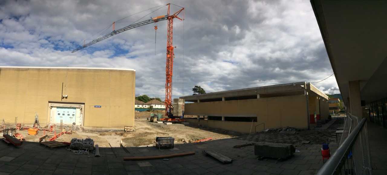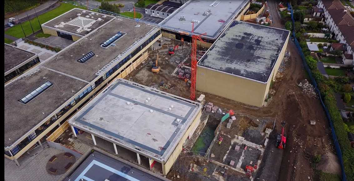 Not long after the State Examinations finished up in June, Project 2018 began on campus. The removal of the prefabs at Easter ensured that no time was wasted once the last students finished up their exams. As the site would need to be completely sealed, initial works on the site included providing safe and secure access to the buildings. As you can see in the photo, access for builders and construction traffic is from the lower carpark, behind the Technology building, up through the Agricultural Science garden and up to the existing sports buildings.